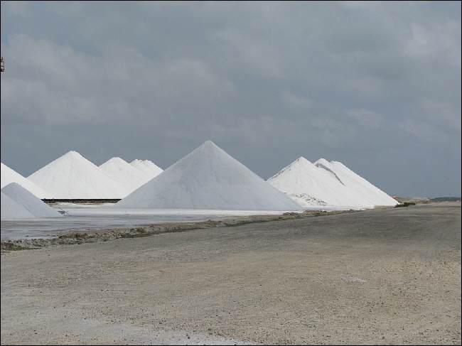 Der flache Süden mit seinen schneeweißen Salzhügeln ist der Anfang zu den Flamingokolonien. |