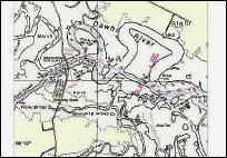 Auf dem Kartenausschnitt sieht man die Begradigung des Flusses. Das Foto daneben zeigt was die Natur daraus gemacht hat. Fuer uns einer der schoensten Ankerplaetze. |