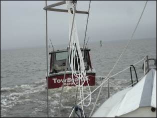 Wieder mal am Haken. Nach dem das Getriebe seinen Dienst eingestellt hat, musste uns TOWBOAT US nach Beaufort abschlppen. 20 Meilen, 4 Stunden. Das kostet ca. 1500,00 $. Die Tow Versicherung war gut angelegtes Geld |