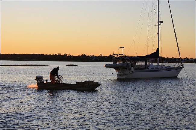 Jetzt, im Jahr 2010, haben wir auf unserer Fahrt auf dem ICW kaum Transportschiffe gesehen. Wir trafen nur noch Freizeitskipper mit ihren Segel- oder Motorbooten, sowie Berufs-oder Hobbyfischer. Die Atlantikseite des Kanals ist eine einfache und gefahrlose Route fuer Bootseigner, die im Fruehjahr in den Norden und im Herbst zurueck in die Sonne wollen. Die Benutzung, auch das Passieren der Bruecken, ist fuer Freizeitskipper frei. Die Berufsfahrt bezahlt nach dem transportierten Gewicht.