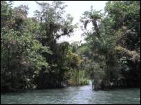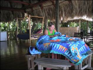 Die Monkeybay-Marina im Dschungel am Rio Dulce ist der ungewoehnlichste Lagerplatz auf unserer bisherigen Reise. Wie eine Marina wirkt die Anlage gar nicht, wenn da nicht die Stege fuer ein paar Boote waeren. Wo hoert man auch sonst so nah die Affen in den Baeumen bruellen neben all dem Vogelgezwitscher? Es gibt ein paar der landestypischen palmstrohgedeckte Huetten fuer Duschen, offene Werkstatt, offene Aussenkueche zur allgemeinen Nutzung mit Gasplatten, Grill und Tiefkuehlschrank und das Schmuckstueck: eine riesige offene Veranda zum Faulenzen mit gemuetlichen Sofas, Haengematten, Tischen und Stuehlen, von Ventilatoren zusaetzlich gut belueftet.
