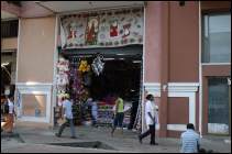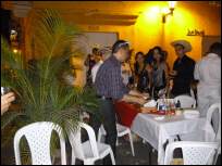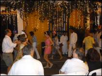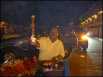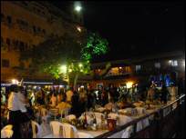 Wie auch in den Kneipen sehen wir nur grosse Flaschen dieses Nektars und riesige Behaelter mit Eis umherwandern. Wie schaffen die Durstigen das bei dieser Hitze, ohne zu Groelen oder auffaellig zu werden. Betrunkene Randalierer erleben hier nicht. Bei diesem Hochprozentigen ebenso erstaunlich wie der ruhige Schlaf der Kinder, die muede geworden einschlafen auf elterlichem Schoss. Denn im Hintergrund glaenzt die groesste Buehne mit Licht- und Lasershow und ohrenzerfetzender Musik. Nun ja, hier halten wir uns nicht so lange auf. Obwohl die spanischsprechende Bevoelkerung sich noch gut unterhalten kann bei dieser Lautstaerke. Kulisse und Atmosphaere sind durch die Beleuchtung und Menschen einmalig.
