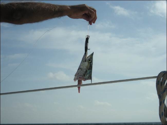 Nach dem Frühstück in der Früh hatten wir dann die 28 sm bis Cayo Largo vor uns. Wir hängten die Angel heraus und hofften, abends unseren frischen Fisch verspeisen zu können. Heute war alles viel angenehmer und es war ein schöner Segeltag. Wir hatten kaum ein paar Minuten abgelegt, schon zurrte die Angel. Was dranhing war nur noch der Fischkopf, beim Anbeißen muß auch gleichzeitig ihn jemand angebissen haben . Wir guckten ganz schön dumm, das war uns auch noch nicht passiert. Na gut, dann eben später. Nun gab es kurz hintereinander noch dreimal Angelalarm, mal hatte Grünzeug aus dem Meer angebissen, mal riß sich ein Fisch noch rechtzeitig los und letztendlich wurden unsere Köder abgebissen und waren nie mehr gesehen. Viel Action, nix in der Pfanne. Jedenfalls hatten wir die Gewißheit, daß es noch viele und große Fische hier geben muß.