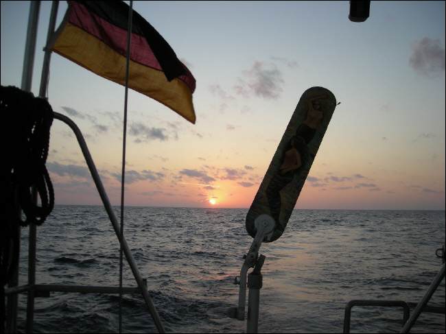 In Sichtweite sehen wir ein Boot, die Lampen mal grün, mal rot leuchten und jede Menge Scheinwerfer. Wir rätseln, was das für ein Fahrzeug ist, denn im Dunkel des Meeres sind nur die Lichter zu sehen und diese Anordnung macht keinen Sinn, gibt aber zu den seltsamsten Vermutungen Anlaß. Ist es überhaupt ein Boot, es könnte auch ein Luftkissenboot oder ein tieffliegender Hubschrauber sein. Arglos bringen wir es nicht mit uns in Verbindung. Mehrere Scheinwerfer leuchten um sich und kommen immer näher. Der Käpt´n will sich auch bemerkbar machen, leuchtet unsere Segel an für den Fall, daß sie uns nicht als Segelboot erkennen und unsere Geschwindigkeit falsch einschätzen.
