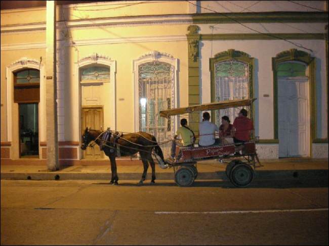 Vom Hafen aus führt eine lange Straße, der Prado, zum Ortszentrum, ca. 3 km. Man nimmt ein Taxi, in diesem Fall ist es üblicherweise eine Pferdekutsche oder Fahrradrikscha. Es ist ein seltsames Gefühl in der Rikscha und der Fahrer muß ganz schön trampeln. Aber manch einer lebt davon und Mitleid und zu Fuß zu gehen hilft ihnen da nicht weiter. Die Pferdeanhänger sind sehr unterschiedlich und nach einigen Fahrten gucken wir uns vor dem Einsteigen immer erst die Reifen an. Fahren wir über den Boulevard gen Zentrum, ist es egal. Es gibt aber zahlreiche Polizeikontrollen unterwegs und nicht alle Kubaner (eigentlich kaum jemand) fahren legal und die müssen dann außen herum hoppeln mit Pferd und Wagen durch die riesigen Löcher der unebenen Straßen und du wirst durchgeschüttelt wie in einem Mixer. Der „Fahrstil“ ist für die hiesigen Straßenverhältnisse sehr rasant und die dünnen Räder schaffen es kaum, am Boden zu bleiben. Mit guten dicken Reifen ist es ein Abenteuer und macht Spaß. Wir sind auch schon manches Mal vor dem Ziel ausgestiegen. Was sind wir doch wieder empfindlich.