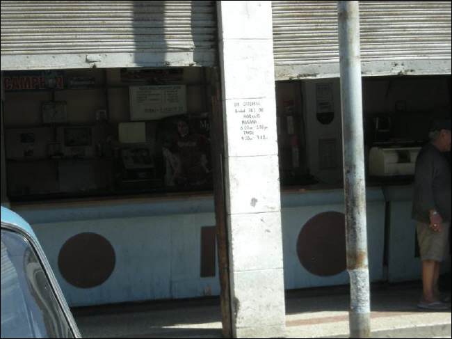 Die Läden, in denen mit Pesos bezahlt wird, sind eigentlich keine richtigen Läden. Meist siehst Du in einem dunklen Durchgang zwischen Häusern oder hinter halbhochgezogenen Jalusien fast leere Regale und vor allem deuten lange Schlangen vor den Gebäuden daraufhin, daß es dort etwas gibt. Schlange stehen ist normal für etwas, sie kennen es nicht anders. Auch das z.B. das Brot erst wieder in 4 oder 5 Stunden erhältlich ist und nicht hier sondern einige Straßen weiter – oder doch dann erst wieder morgen. Die Preise im Peso-Handel sind dem geringen Einkommen angepaßt, umgerechnet handelt es sich fast nur um ein paar Cents für die Ware, wenn denn etwas zum Verkauf vorhanden ist. Ein völlig normaler Anblick eines Peso-Laden: