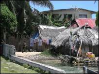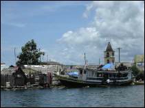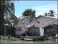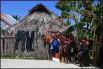 Ganz in der Naehe, die zweite „groessere“ Insel Uargandup wirkte aehnlich auf uns. Die Groesse der Inseln drueckt sich nur darin aus, dass es viel mehr Huetten und zusaetzlich ein paar gemauerte Behausungen gibt und hier die einzig hochgebaute Kirche herausragt aus der Menge. Wo sonst auf den Inseln wenige Huetten und viele Palmen zuhause sind, fehlen hier die Baeume und dichtgedraengt ist die Bebauung.