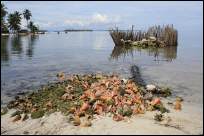 Wir fragen die Kunas, was los ist und sie erklaeren uns, dass der Sohn des Staatspraesidenten soeben mit Freunden gebracht wurde und auf der Yacht verbringen sie nun das Wochenende. Abwechslung fuer die Segler und auch fuer die Kunas. Die Kunas sammeln unermuedlich Lobster auf den Riffen fuer die prominenten Gaeste und die Frauen paddeln saemtliche Molas an die Luxusyacht. Wir beobachten, dass sie freundlich empfangen werden und vor allem Fisch und Lobster den Besitzer wechseln.