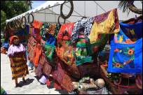 Am Abend ist Action in der kleinen Strohhuetten-Kirche der naheliegenden Insel Nalunega. Wir sitzen draussen und lauschen ueber 2 Stunden lang dem Gesang und der Live-Musik auf handgefertigten Instrumenten im heimischen Stil. Trommeln, Rasseln aus Kokosnuessen usw. Angenehm und wohltuend, da muss man gar nicht den Kunadialekt verstehen........ ein wenig gespenstisch, weil die Insel rabenschwarz im Dunkel liegt, es gibt nur in der Mitte des Dorfes eine schwache Beleuchtung. Die Kunas leuchten ihren Heimweg mit der Taschenlampe aus.