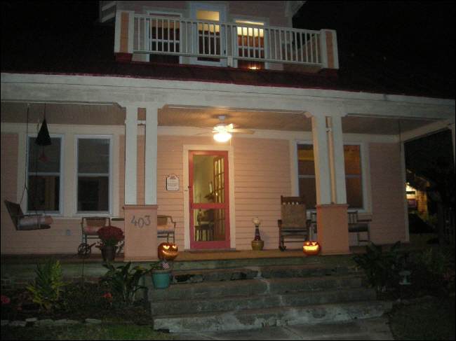 Die kleinen typischen Suedstaaten-Holzhaeuser mit Veranden und Schaukelstuehlen sind allesamt reichlich geschmueckt und abends beleuchtet mit kunstvoll geschnitzten Kuerbiskopfen. Die grausigsten Gebisse der Kuerbisse zierten die Treppe des Hauses beim hiesigen Zahnarzt und seiner Familie. Hier feiern wir an Halloween meinen Geburtstag und ich bin gluecklich mit der Auswahl des Ortes fuer diesen Tag.