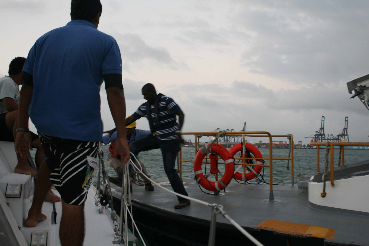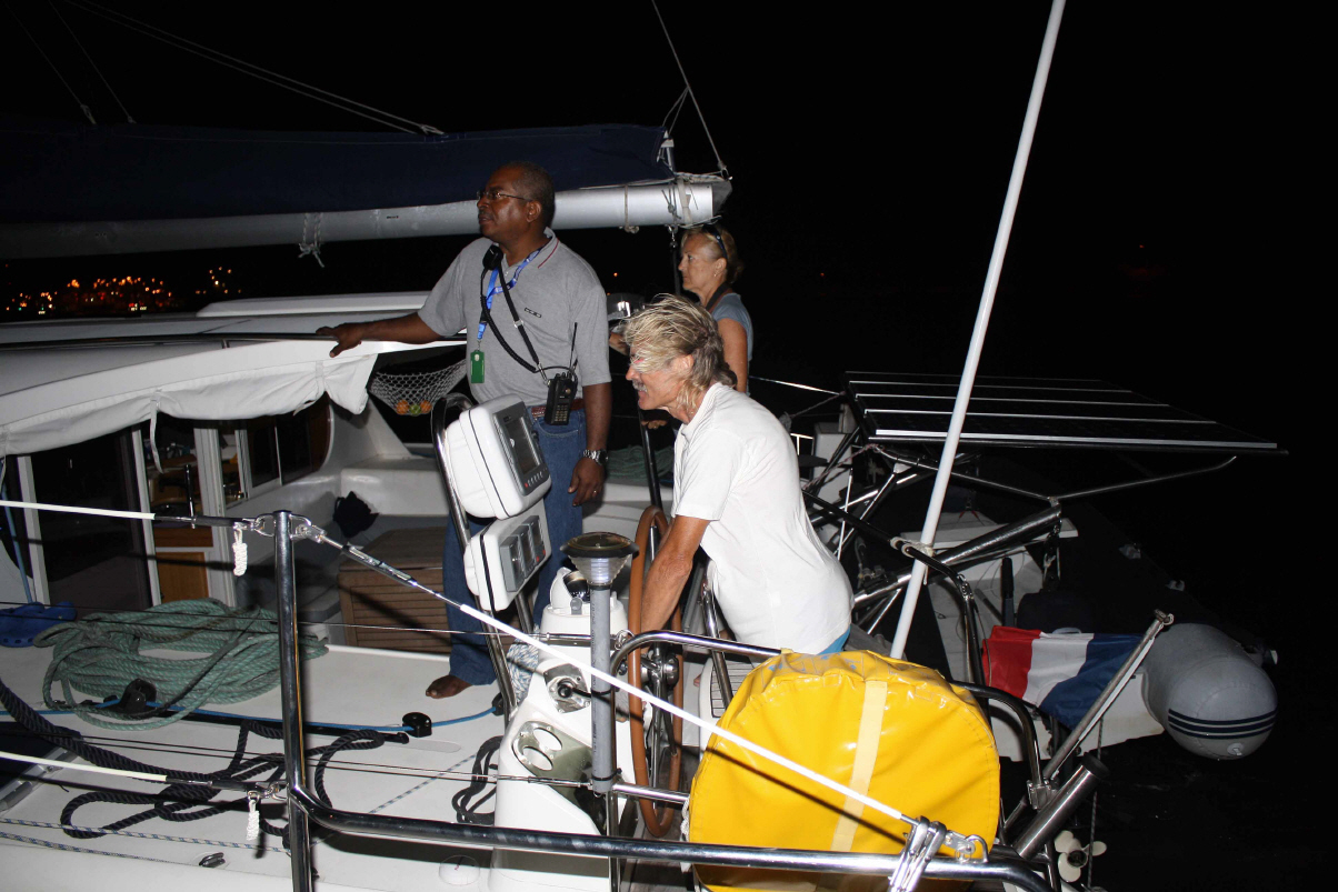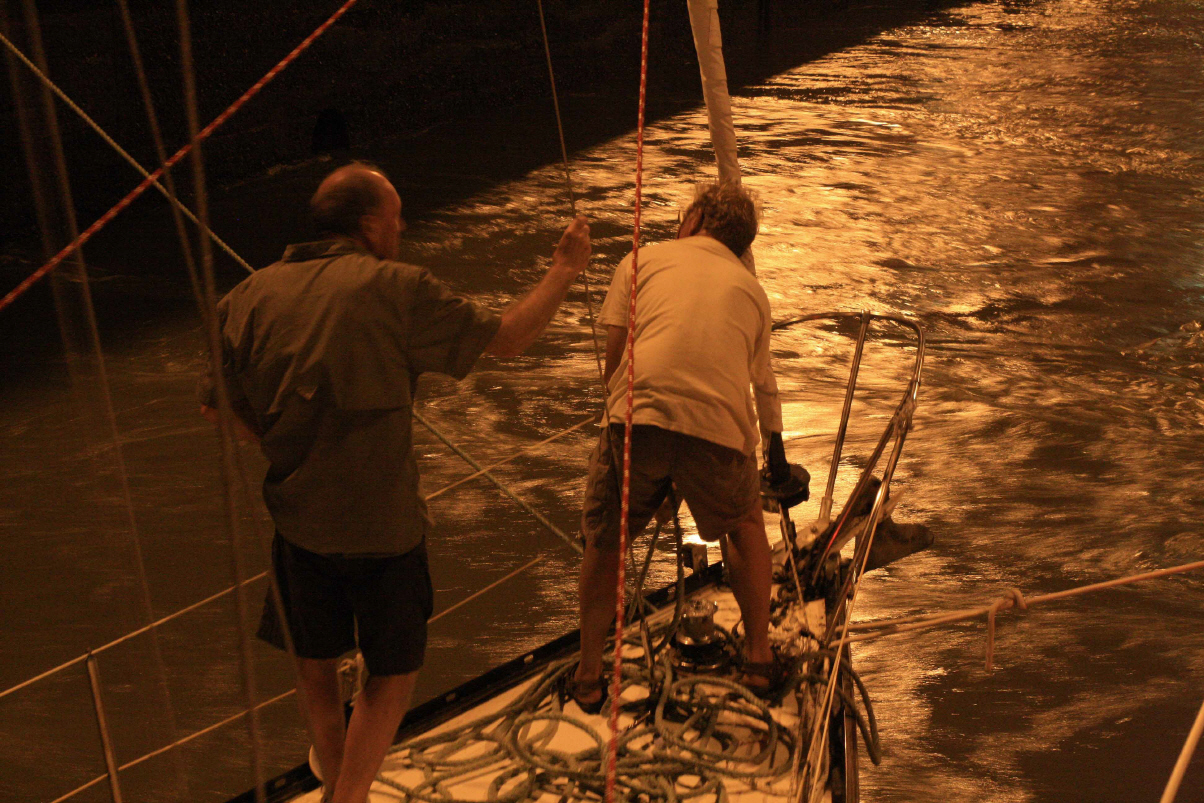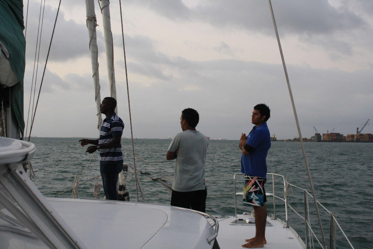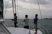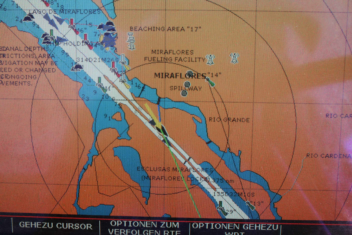 Am Donnerstagmittag sollte es losgehen. Zuerst zum Ankerfeld „F= Flats“, das am Anfang der Gatunschleuse liegt. Die beiden zusätzlich angeheuerten Linehandler waren schon an Bord. Später sollte der Lotse auf den Flats dazu kommen. Die Vorschrift besagt, dass jedes Schiff vier Linehandler, einen Skipper, der nur am Ruder steht, sowie einen Lotsen haben muss.