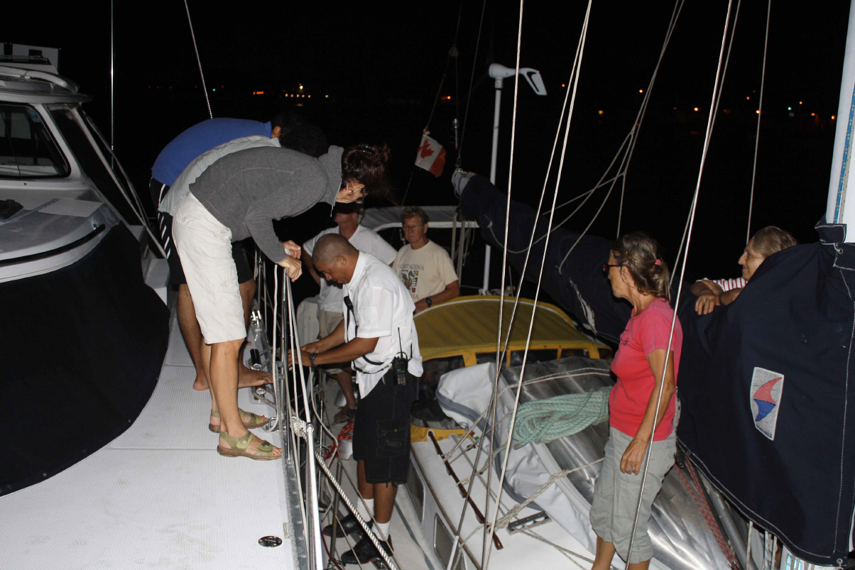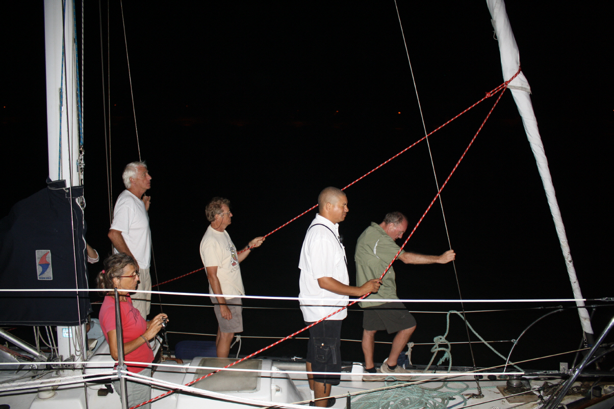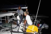 |   |   |   | von links: an der steuerbord Seite ein franzoesicher Katamaran, an Backbord ein kanadischer Mono, alle Augen nach vorne. |