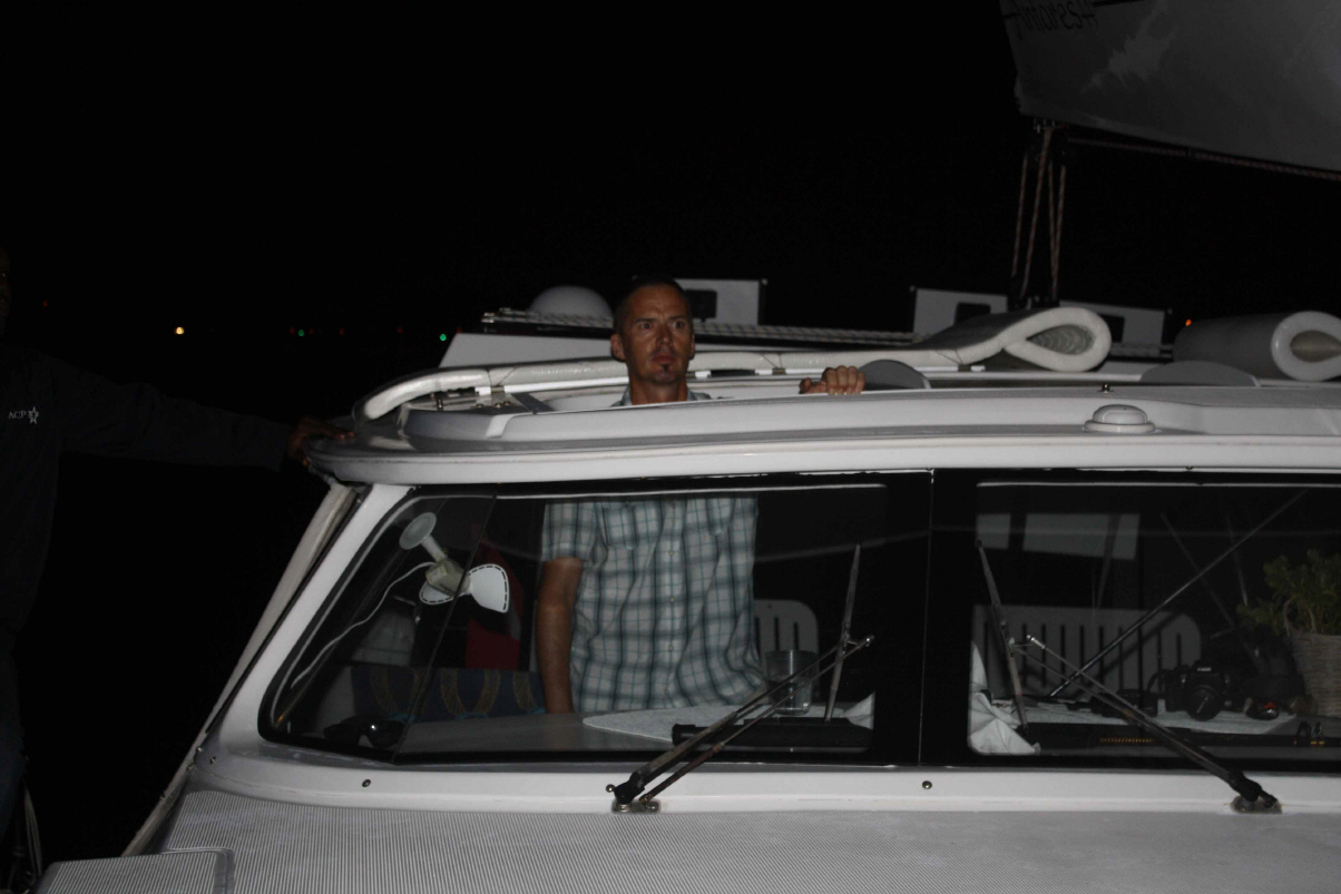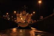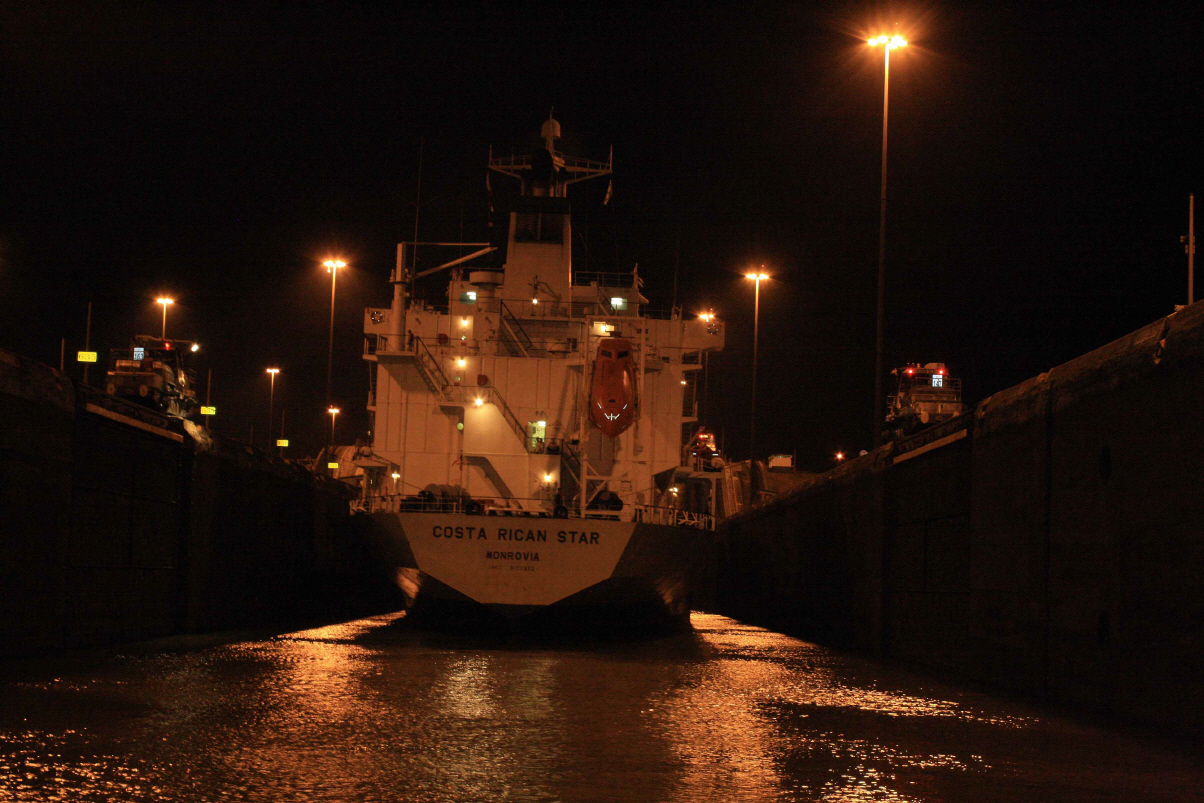 Nach kurzer Zeit ertönt bei uns wie auf dem Kasernenhof die Trillerpfeife und auch wir setzen uns mit unseren „Mulas“ an Land, die jetzt die Leinen in der Hand halten, zur nächsten Kammer in Bewegung. Hier und in der letzten Kammer folgt das gleiche Ritual und dann sind wir im Gatunsee, 27 m über der Karibik und dem Pazifik. Abgesehen von einigen spannenden Momenten, in denen man Rufe in einem babylonischen Stimmengewirr hören konnte (waren in unserem kleinen Päckchen 7 verschiedene Sprachen) ging alles ruhig und ohne Schäden über die Bühne, sprich durch die Schleuse. Kurz nach 22 Uhr fiel  der Anker. Der Lotse ging von Bord und wir genehmigten uns ein Ankommbier. Etwas später war Ruhe im Schiff. War es doch ein langer und spannender Tag.