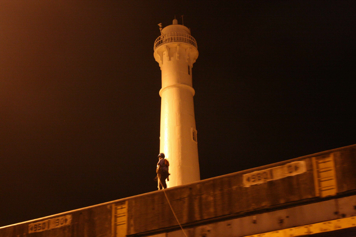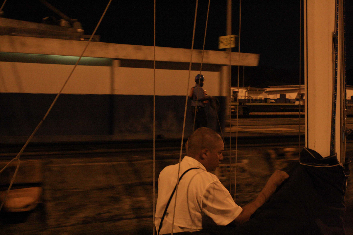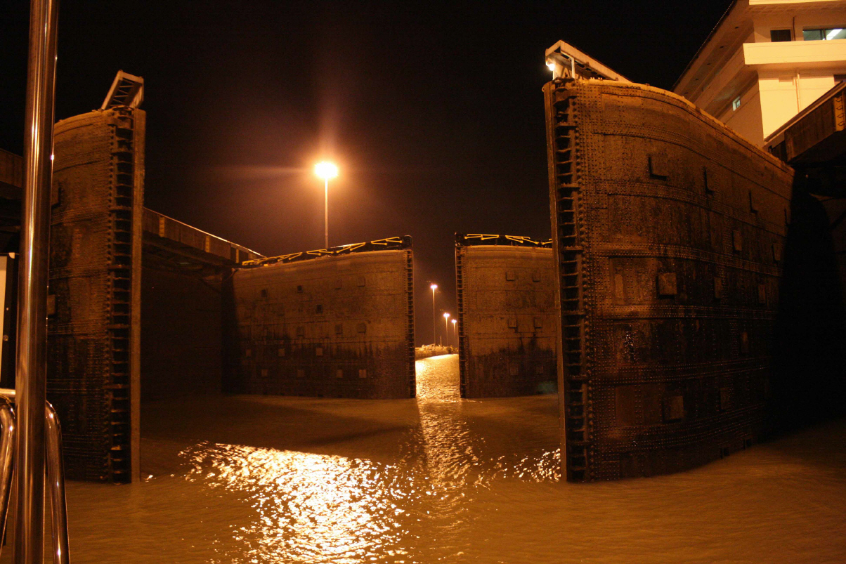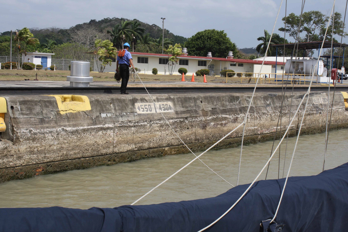 Die Gatunschleuse in der Nähe von Colon besteht aus drei Kammern, die jeweils ca. 8 m schleusen. Wenn man in die erste Kammer einfährt, bekommt man je vier Leinen zugeworfen. Daran werden stärkere Taue befestigt, an Land zurückgezogen und an Pollern befestigt.