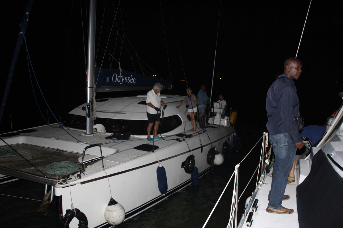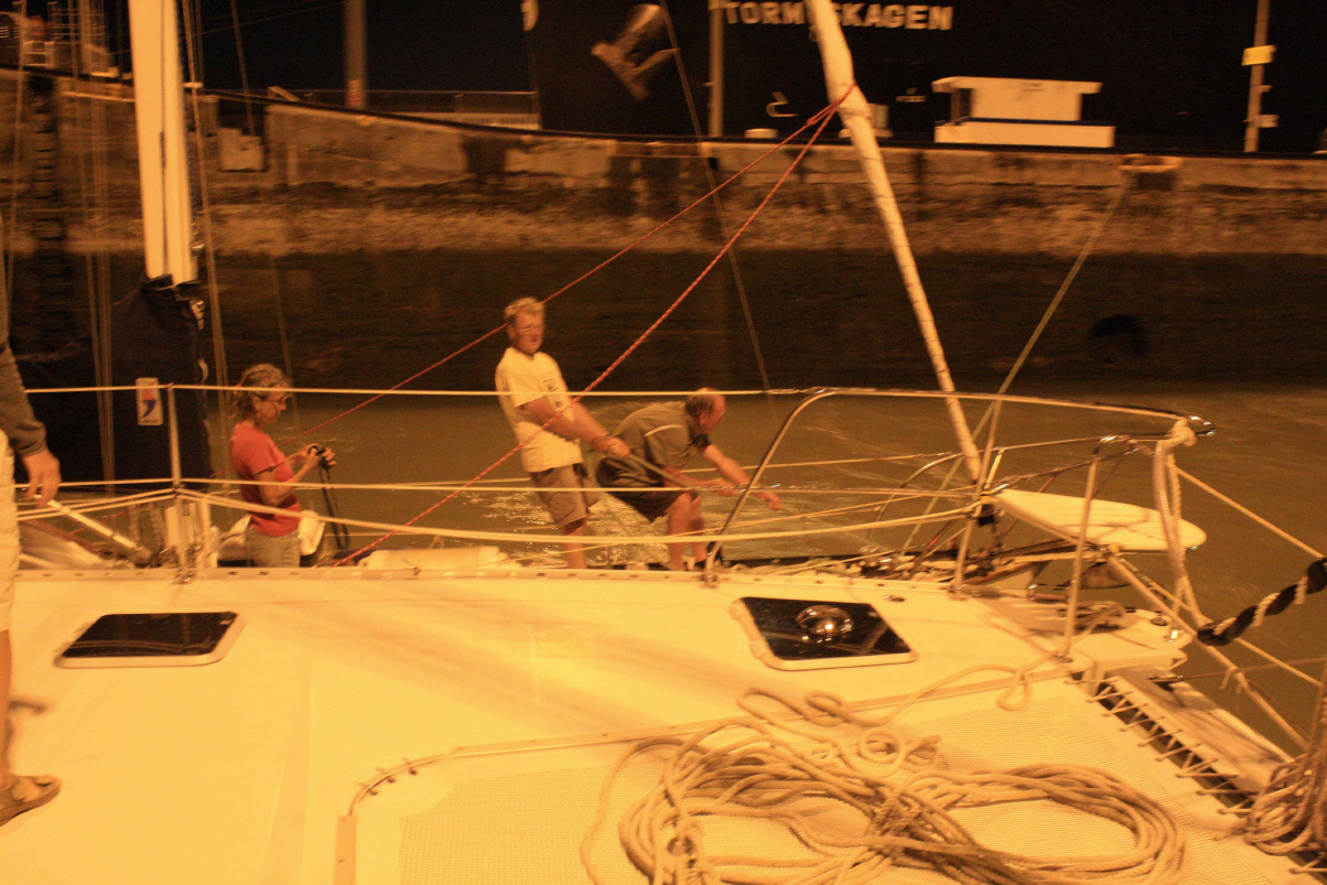 Mit über einer Stunde Verspätung ging es dann Richtung Schleuse. Wir sollten mit einem 180 m großen Frachter so gegen sechs Uhr geschleust werden. Wir, das waren noch zwei andere Boote. Ein französischer Kat, etwas kleiner als „Samuri“ an der Backbordseite, Samuri in der Mitte, sowie ein kanadisches Segelboot an Steuerbord. Alle Drei zu einem Päckchen verbunden und wie ein Schiff geschleust. Spannend