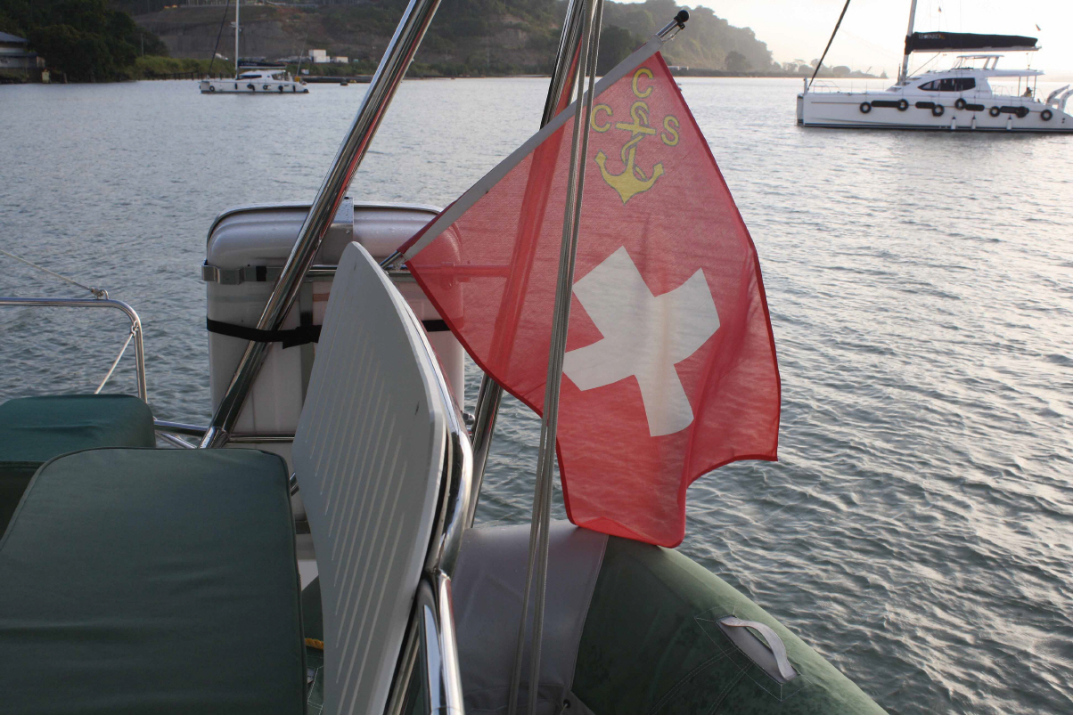 |   |   |   | von links: Die Schweizer Flagge auf den Weltmeeren, die Besatzung fuer die Kanalfahrt, Samuri verlaesst den Hafen. |