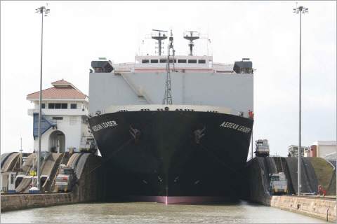 Gegen zwei waren wir an der Schleuse Pedro Miguel. Hier wurde wieder das Päckchen geschnürt und der letzte Akt der Kanalfahrt begann. Dieses Mal fuhren wir als erste vor einem Autotransporter in die Kammer. Es war schon beeindruckend so ein riesiges Schiff ein paar Meter hinter sich zu haben. Unser Partner heute war grösser als der vom Vortag und die Rede von der Zeitung die rechts und links zwischen Schiff und Wand passt ist keine Übertreibung. Man kann in diesem Moment nur hoffen, dass die Mulas anders als ihre lebenden Namensvetter nicht bockig sind und ihre Arbeit ohne eigenen Willen erledigen. Das Konzert von bing bing usw. war das gleiche wie gestern. Die Schleuse Pedro Miguel hat nur eine Kammer. Miraflores, mit seinen zwei Kammern liegt 1,5 Meilen weiter. Das letzte Stück blieben wir noch einträchtig nebeneinander.