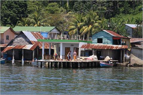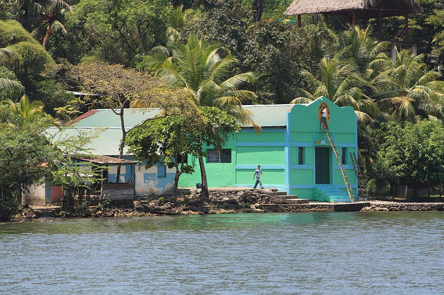 Wir hoeren bereits vom Boot aus die Reggea-Klaenge, Marimba-Musik und es herrscht ein geschaeftiges Treiben an Land. Staendig kommen Boote mit Ladungen von Lebensmitteln, Mehl-Maissaecke, ein Matratzenboot faehrt an den Steg und dort werden gerade Schaukelstuehle ausgeladen. Dort am Steg wird die Ware mit Autos abgeholt, die fuer viel Geld mit grossen Faehren hierhin verfrachtet wurden. Es gibt 2 oder 3 Strassen im Dorf und Holzhaeuser in bunter abgeblaetterter Farbe sorgen fuer karibisches Flair.