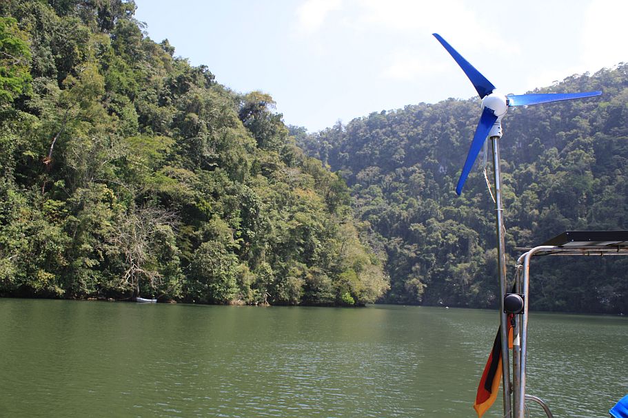 Dienstags ist es endlich soweit, wir motoren den Rio Dulce hoch, ca. 25 sm bis zu unserem Zuhause fuer die naechsten Monate, die Monkeybay-Marina. Allein diese Fahrt durch den Dschungel Guatemalas entschaedigt uns fuer die schaflosen Naechte und schraegsten Wellen im Golfstrom.
