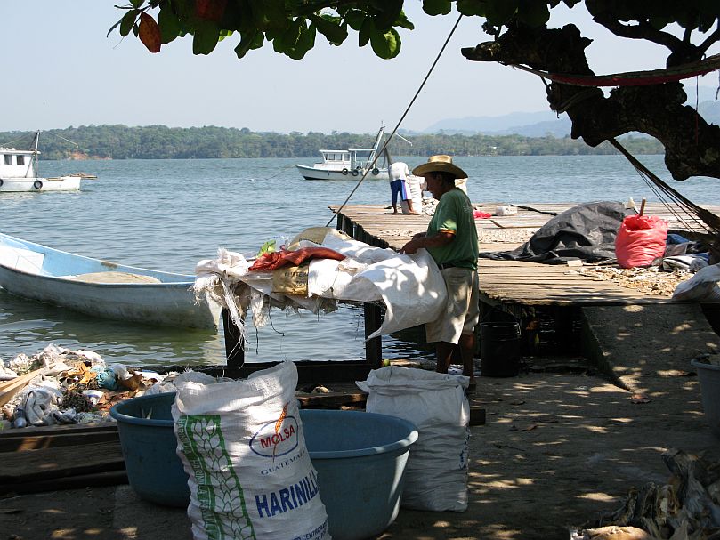Die Segler klarieren hier nur ein und fahren gleich weiter zum Rio Dulce. Manche empfinden den Ort als zu schmuddelig oder unorganisiert, anderen ist die entspannte, gelassene Atmosphaere sehr angenehm. Uns gefaellt es hier, wir spazieren in den Ort hoch . Die wenigen Strassen schaffen wir trotz der hohen Temperaturen. Laengs des Ufers weht ein bisschen Wind und hier sind zahlreiche Gestelle aufgebaut, auf denen der Dorsch getrocknet wird fuer den beruehmten Stockfisch. Die meisten Familien leben vom Fischfang und fuer guatemaltekische Verhaeltnisse geht es ihnen recht gut damit.