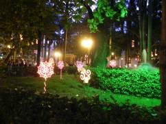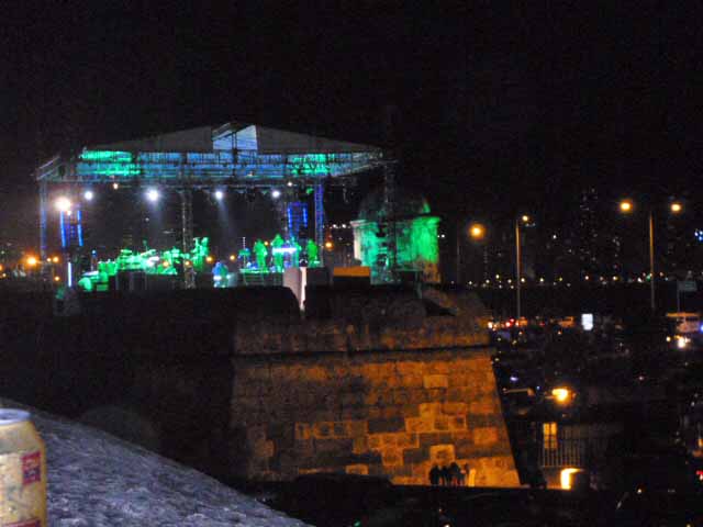 Wie auch in den Kneipen sehen wir nur grosse Flaschen dieses Nektars und riesige Behaelter mit Eis umherwandern. Wie schaffen die Durstigen das bei dieser Hitze, ohne zu Groelen oder auffaellig zu werden. Betrunkene Randalierer erleben hier nicht. Bei diesem Hochprozentigen ebenso erstaunlich wie der ruhige Schlaf der Kinder, die muede geworden einschlafen auf elterlichem Schoss. Denn im Hintergrund glaenzt die groesste Buehne mit Licht- und Lasershow und ohrenzerfetzender Musik. Nun ja, hier halten wir uns nicht so lange auf. Obwohl die spanischsprechende Bevoelkerung sich noch gut unterhalten kann bei dieser Lautstaerke. Kulisse und Atmosphaere sind durch die Beleuchtung und Menschen einmalig.