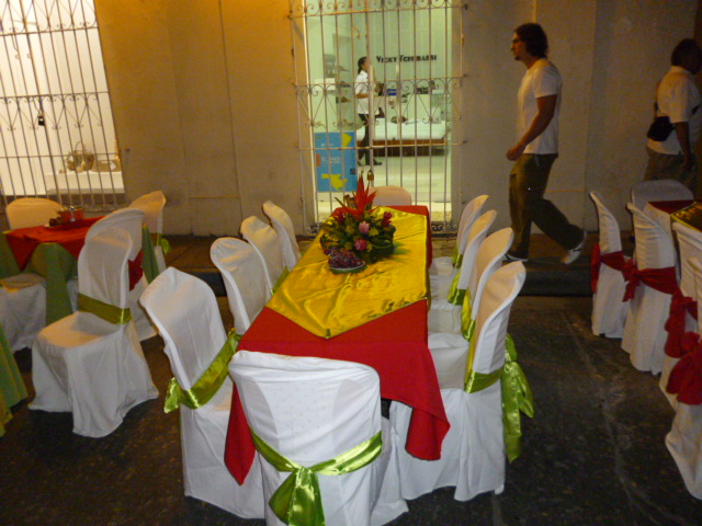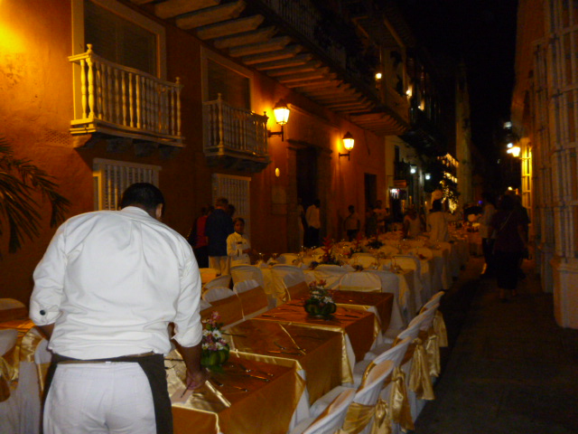 Die Gassen, durch die wir sonst schlendern, sind zugestellt mit festlich geschmueckten Tischen und Stuehlen. Wir schlaengeln uns dort entlang. Die Menge feiert draussen, die Plaetze sind vorbestellt und das Essen wird draussen serviert. Die exclusivsten Plazas vor den historischen Kirchen sind abgeteilt und Security wacht darueber, dass nur die edelsten Glitzer- und Glemmerleute ihre Tische besetzen.