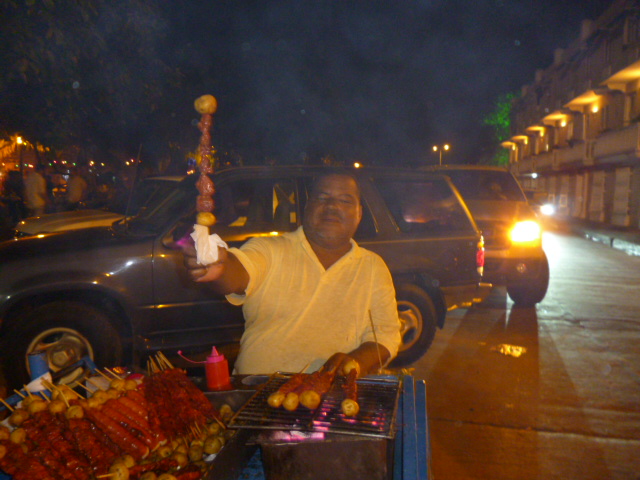 Manchmal sitzen wir auf einer der glaenzenden Kanonenkugeln am Strassenrand, schluerfen unseren gut gekuehlten Mumm-Sekt aus dem Flaeschchen und fuehlen uns sauwohl. Gold und Glitzerkleider, Seidenanzug und Rolex – Wuerstchen vom Grill und Sitzplaetze auf der Decke am Strassenrand – so bunt und lebendig ist die heutige Mischung Leben. Mui bien, mui bueno!!!!