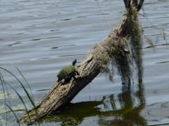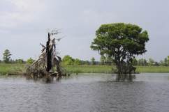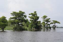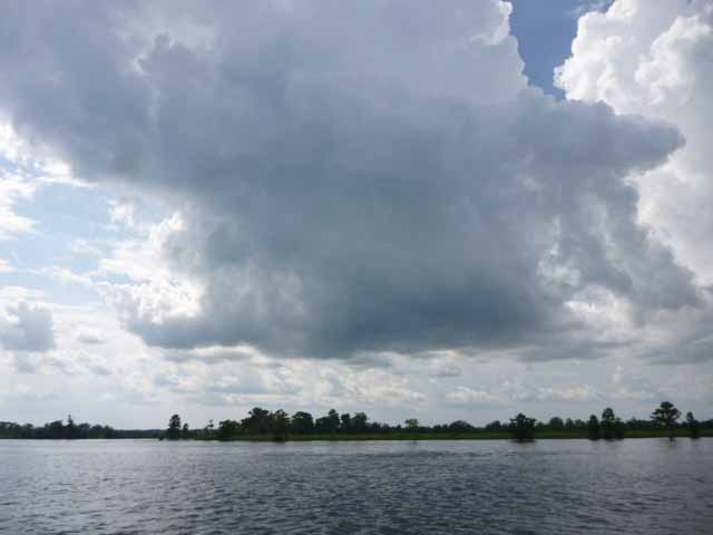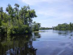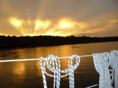 Nichts deutet darauf hin, dass es ausser uns noch Menschen gibt. Hier vermissen wir sie auch nicht. Wir sind rundum gluecklich, dass wir das so erleben duerfen. Morgens begruessen uns beim Fruehstueck meist die Delfine, um diese Zeit sind sie besonders munter und tummeln sich um das Boot herum. Einmal entdecken wir ein Manatee, selten tauchen sie so deutlich an der Oberflaeche auf.