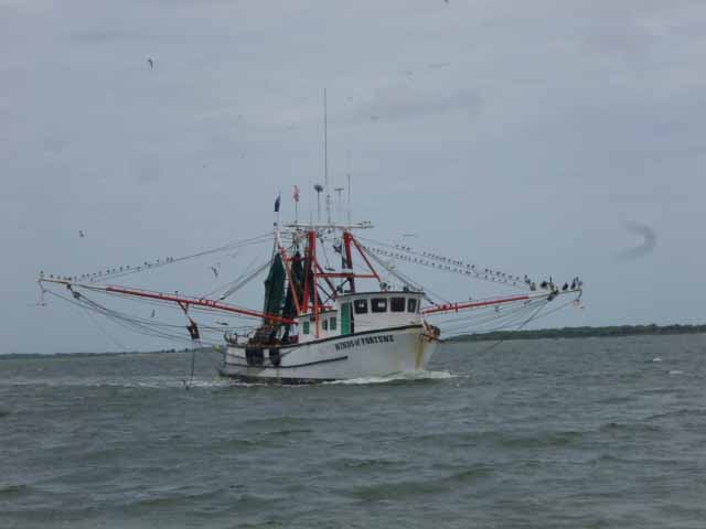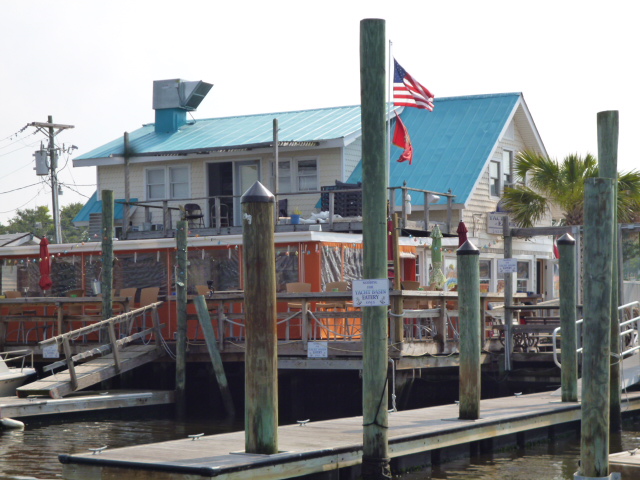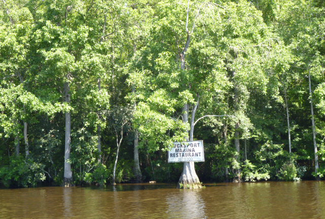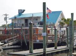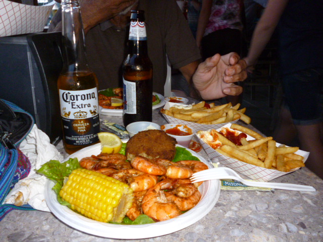 In Southfork fahren wir praktisch ueber die unsichtbare Grenze von Sued-Carolina nach North-Carolina und als unterwegs ein Fischrestaurant liegt, das mit kostenlosem Steg fuer die Nacht wirbt, haben wir Lust, das Angebot anzunehmen. Ist ja Wochenende und da geht man gern aus ... Wir erkundigen uns nach dem Anlegen, ob wir tatsaechlich dort ueber Nacht bleiben koennen? Ja, nur essen muesse man dann dort. Klar doch, das wird uns keine Muehe machen. Wir goennen uns die Spezialitaet des Hauses, Scampi mit Local-Crab-Cake, Maiskolben, French Fries und Corona-Bier. Wenn wir schon so luxurioes kostenlos am Steg liegen duerfen, wollen wir uns doch dafuer revanchieren.
