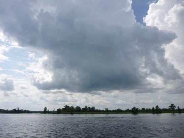 Aber zu frueh gedacht, es kam nur spaeter. Am Mittag wird es rabenschwarz am Himmel und der Sturm legt los. Bis 35 kn sehen wir auf dem Windmesser. Alle Segel sind runter und wir verkriechen uns im Boot und koennen nur abwarten. Fuer mich ist es die erste richtige Sturmerfahrung, der Kaeptn hatte es schon mal erlebt und vertraut seinem Boot. 2,5 Stunden dauert der Spuk, endlose Zeit unter diesen Umstaenden. Ich verspreche meinem Kaeptn, wenn wir dieses Unwetter gut ueberstehen, werde ich nie mehr mit ihm zanken – als eine Art Angebot an die Goetter, uns wohlgesonnen zu sein. Der Sturm laesst nach und nun erinnert mich Wilfried natuerlich bei jeder Gelegenheit rechtzeitig an mein Versprechen.