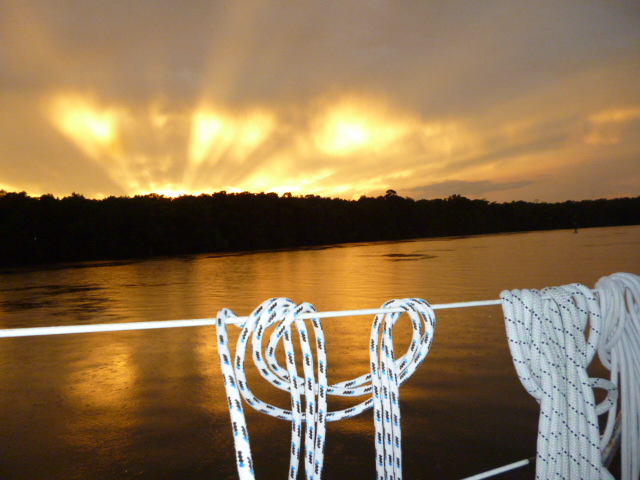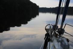 In den naechste Tagen fuehrt der Weg wieder durch den ICW, tagsueber fahren wir und zum Sonnenuntergang suchen wir rechtzeitig eine Ankerbucht auf. Als unterwegs der elektrische Autopilot seinen Dienst verweigert und klar wird, dass er ihn nicht mehr aufnehen wird, bestellt Wilfried ein neues Geraet und sucht als Lieferadresse Westmarine in Wilmington aus. Fragt die Landratte uns manchmal, wie macht Ihr das eigentlich unterwegs mit einkaufen usw...... hier ein gutes Beispiel. In Kuestennaehe kann Wilfried auf seinem I-Pad ins Internet. Adressen googeln, Kontakt aufnehmen per Skype mit entsprechenden Firmen oder TO-Stuetzpunktleitern. Bestellungen aufgeben, nachdem geklaert ist, wann wir ungefaehr wo sind. Kommen wir dort an, wartet das Paket schon auf den Abholer. Klappt wunderbar, wir sind begeistert. Was man so alles erledigen kann auf einsamen Strecken.