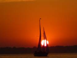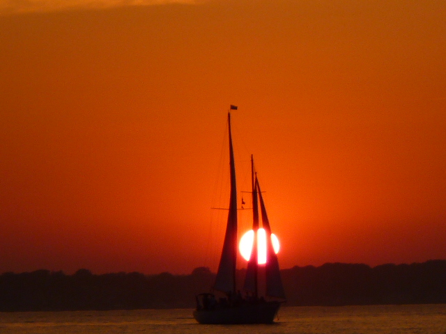 Zum Tagesausklang grillen wir draussen an der Reling Steaks und Kartoffeln mit Sauerrahm und knabbern gruenen Salat. Fuer den Augenschmaus sorgt die Sonne, als sie untergeht. Tiefrot faerbt sich der Himmel, die dichten gruenen Waelder im Hintergrund zeichnen sich schwarz ab wie gemalt und die Moewen und Seevoegel piepsen und schreien sich die Tagesereignisse zu, bevor sie sich endgueltig auf die Aeste und unbemannten Boote zum Schlafen begeben. Die Luft wird merklich kuehler und angenehm. Diese Abende sind unbeschreiblich schoen. Satt und zufrieden liegen wir wenig spaeter in der Koje.