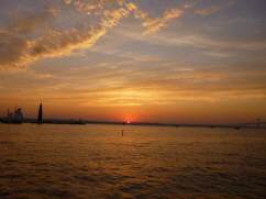 Wassertaxi faehrt herum und kutschiert Leute von Ufer zu Ufer. Wir bleiben an Bord, Newport Waterfront wird zu allen Zeiten frequentiert am Wochenende und platzt aus allen Naehten, an diesem Abend um so mehr. Da haben wir es an Bord gemuetlicher. Belohnt werden wir mueden Krieger wieder einmal mit einem tollen Sonnenuntergang.