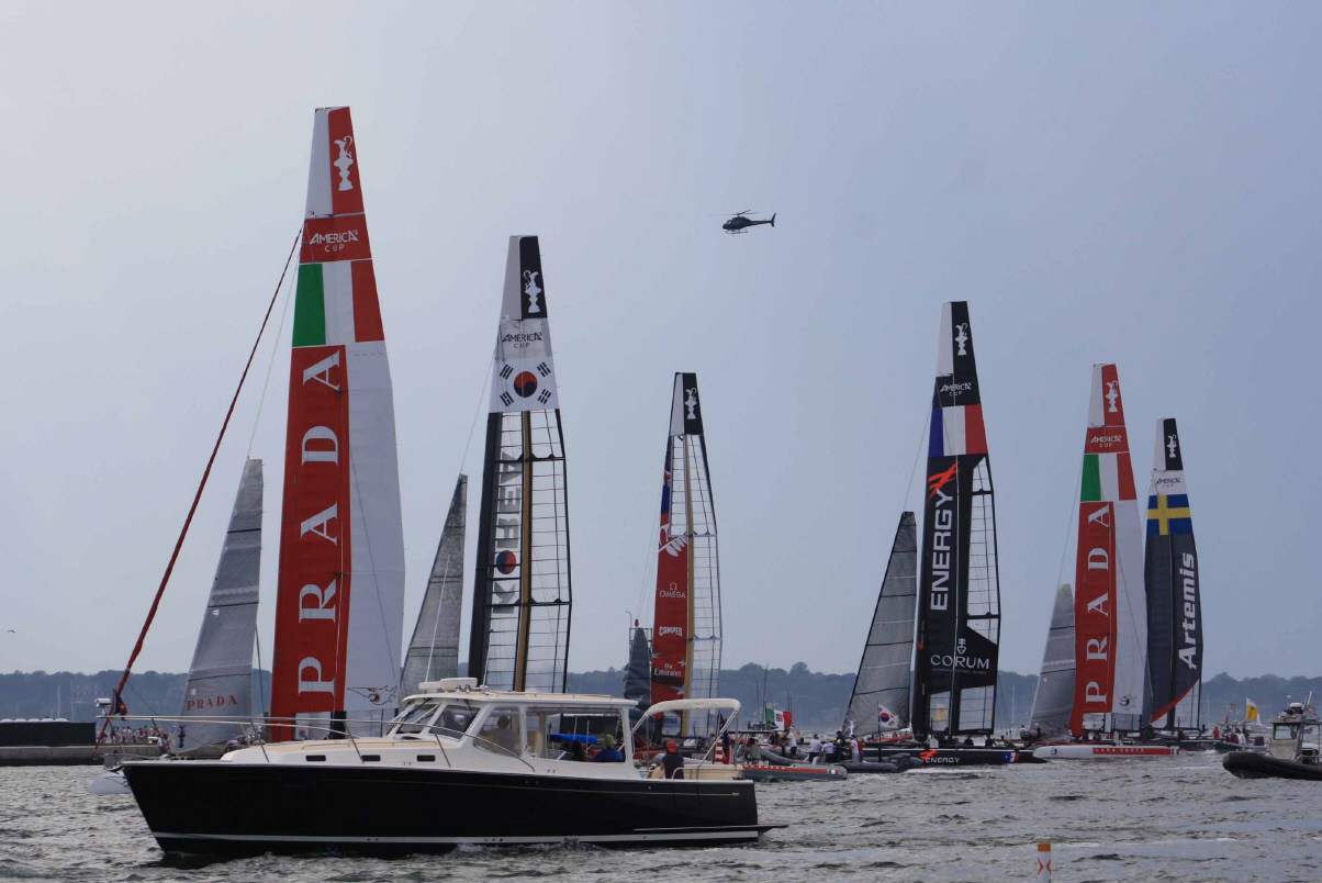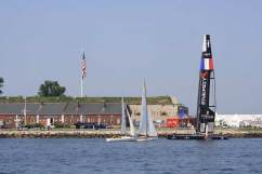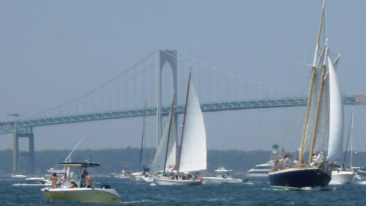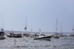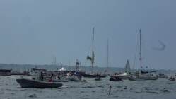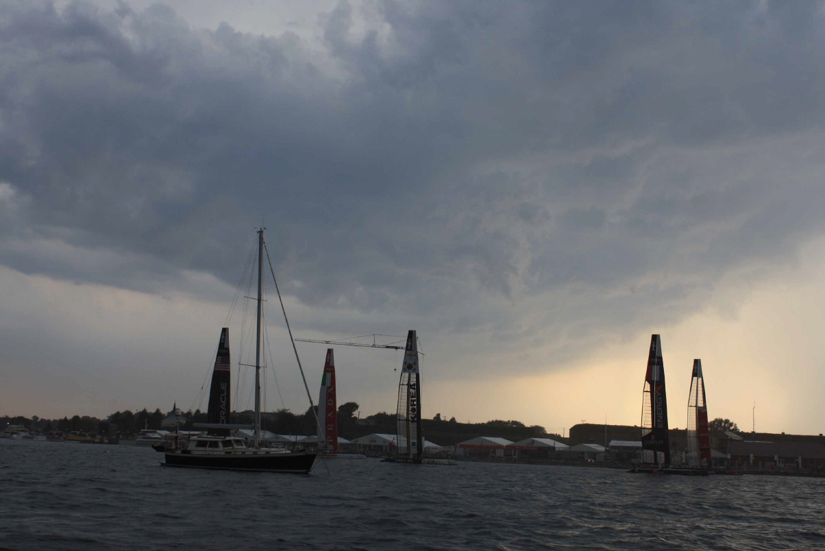 Wind fuer den Show-Down kommt sonntags erst gegen Mittag auf. Gutes Timing braucht so ein Rennen, kaum ist der Sieger gekuert, die Ufer als Siegesrunde mit Knaller und Getoese noch einmal abgefahren, im Schlepptau die Prozession der segelnden und paddelnden Fangemeinde – oeffnet der Himmel seine Schleusen bei Gewitter und Regen aus pechschwarzen Wolken. Der Rest der Siegesfeier wird also im Fort Adams im Trocknen fortgesetzt.